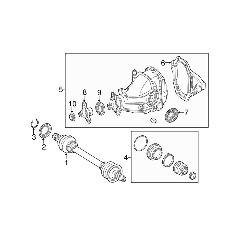 Axle Assembly - This refers to the axle shafts that are found at the front of a FWD vehicle, and at the rear of an AWD car or SUV. They do not support any vehicle weight - they just transfer power from the engine to the wheel.